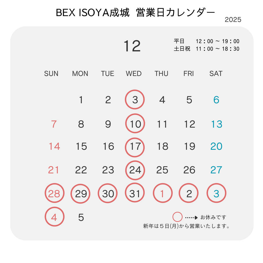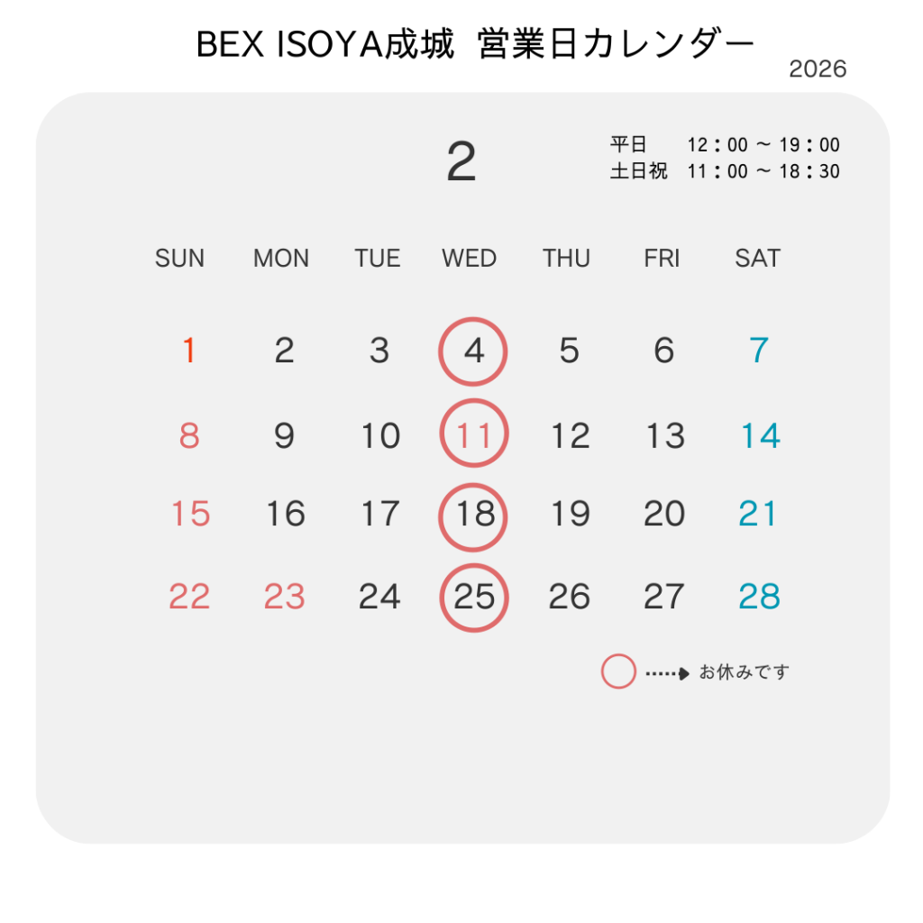 BEX ISOYA 成城店、今月の営業日カレンダーのお知らせです。
